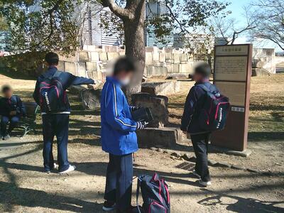 この校外学習は、3年生の広島修学旅行に向けた平和学習の一環として位置づけており、「ピースおおさか」、「砲兵工廠跡」、「大阪城」などのチェックポイントを自分たちで決めた班でまわりました。